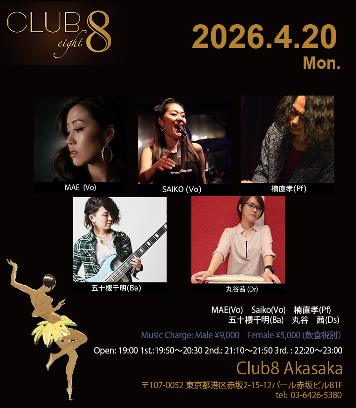 4/20(月)MAE(Vo)Saiko(Vo)楠直孝(Pf)五十棲千明(Ba)丸谷 茜(Ds)Open: 19:001st.: 19:50〜20:302nd.: 21:10〜21:503rd. : 22:20〜23:00 […]