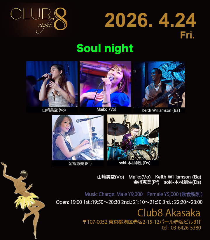 4/24(金)【Soul night】 山﨑美空(Vo) Maiko(Vo) Keith Williamson (Ba) 金指恵美(Pf) soki-木村創生(Ds) Open: 19:00 1st.: 19:50〜20 […]
