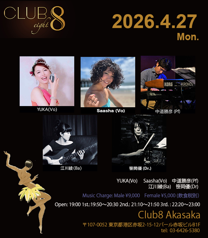 4/27(月)YUKA(Vo)Saasha(Vo)中道勝彦(Key)江川綾(Ba)笹岡 優(Ds)Open: 19:001st.: 19:50〜20:302nd.: 21:10〜21:503rd. : 22:20〜23: […]
