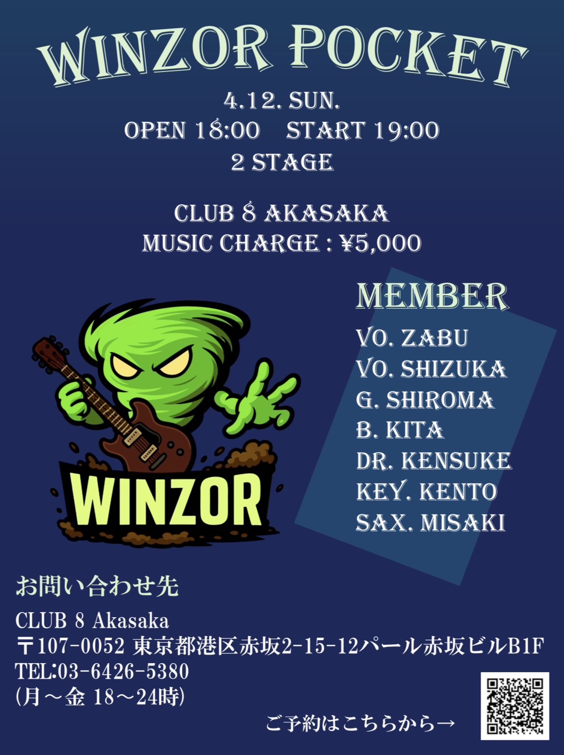 4/12(日)【WINZOR POCKET 】 ZABU(Vo. ) SHIZUKA(Vo. ) SHIROMA(G. ) KITA(B. ) KENSUKE(Dr.) KENTO(Key. ) MISAKI(SAX.) […]