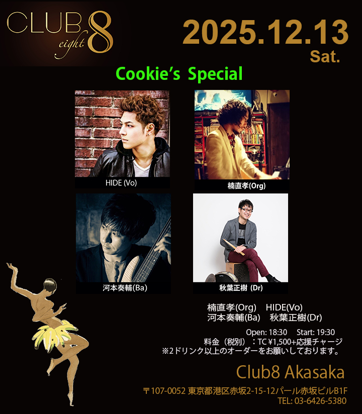 12/12(金)【Soul night】 ZABU(Vo)Saiko(Vo)Keith Williamson(Ba)金指恵美(Pf)下久保昌紀(Ds) Open: 19:00 1st.: 19:50〜20:30 2nd. […]