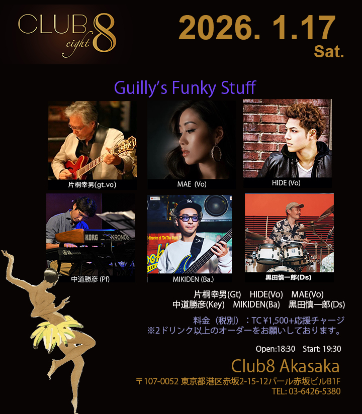 1/17(土)【Guilly’s Funky Staff】片桐幸男(Gt)HIDE(Vo)MAE(Vo)中道勝彦(Key)MIKIDEN(Ba)黒田慎一郎(Ds)Open:18:30Start: 19:30料金(税別): […]