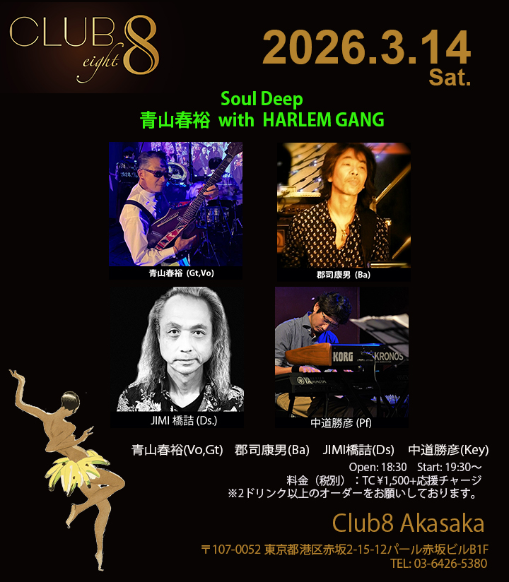 3/14(土)【Soul Deep 】 青山春裕 with HARLEM GANG 青山春裕(Vo,Gt)郡司康男(Ba)JIMI橋詰(Ds)中道勝彦(Key) Open: 18:30 Start: 19:30〜 料金( […]