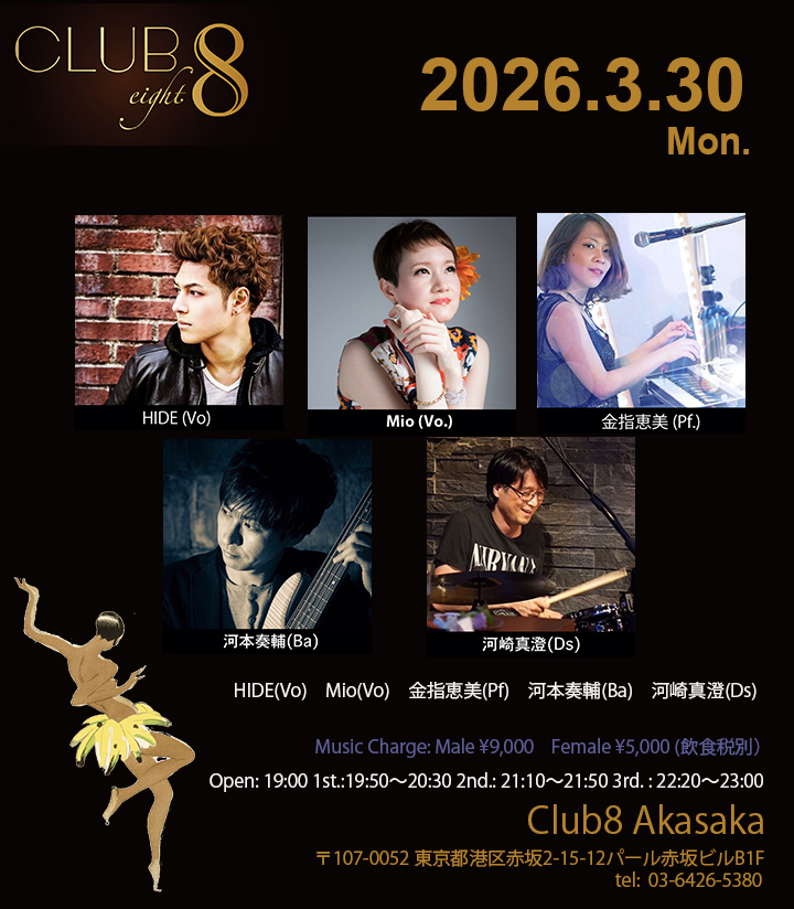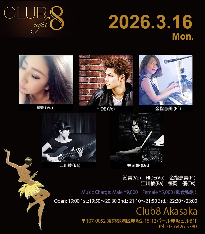 3/10(火) MAE(Vo)HIDE(Vo)堺敦生(Pf) Open: 19:00 1st.: 19:50〜20:30 2nd.: 21:10〜21:50 3rd. : 22:20〜23:00 CLUB 8 Akasa […]
