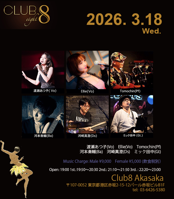 3/18(水) 渡瀬あつ子(Vo) Ellie(Vo)Tomochin(Pf) 河本奏輔(Ba) 河崎真澄(Ds) ミック田中(Gt) Open: 19:00 1st.: 19:50〜20:30 2nd.: 21:10〜 […]
