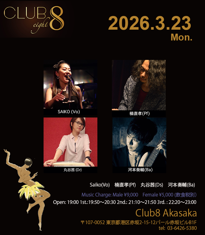 3/23(月) Saiko(Vo)楠直孝(Pf)丸谷茜(Ds)河本奏輔(Ba) Open: 19:00 1st.: 19:50〜20:30 2nd.: 21:10〜21:50 3rd. : 22:20〜23:00 CLU […]
