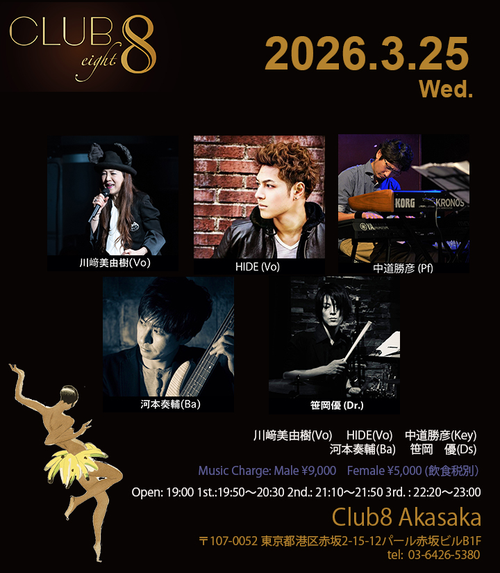 3/25(水) 川﨑美由樹(Vo) HIDE(Vo)中道勝彦(Key) 河本奏輔(Ba) 笹岡 優(Ds) Open: 19:00 1st.: 19:50〜20:30 2nd.: 21:10〜21:50 3rd. : 2 […]