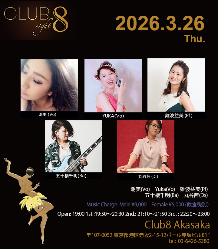 3/26(木) 潮美(Vo)Yuka(Vo)難波益美(Pf)五十棲千明(Ba)丸谷茜(Ds) Open: 19:00 1st.: 19:50〜20:30 2nd.: 21:10〜21:50 3rd. : 22:20〜23 […]