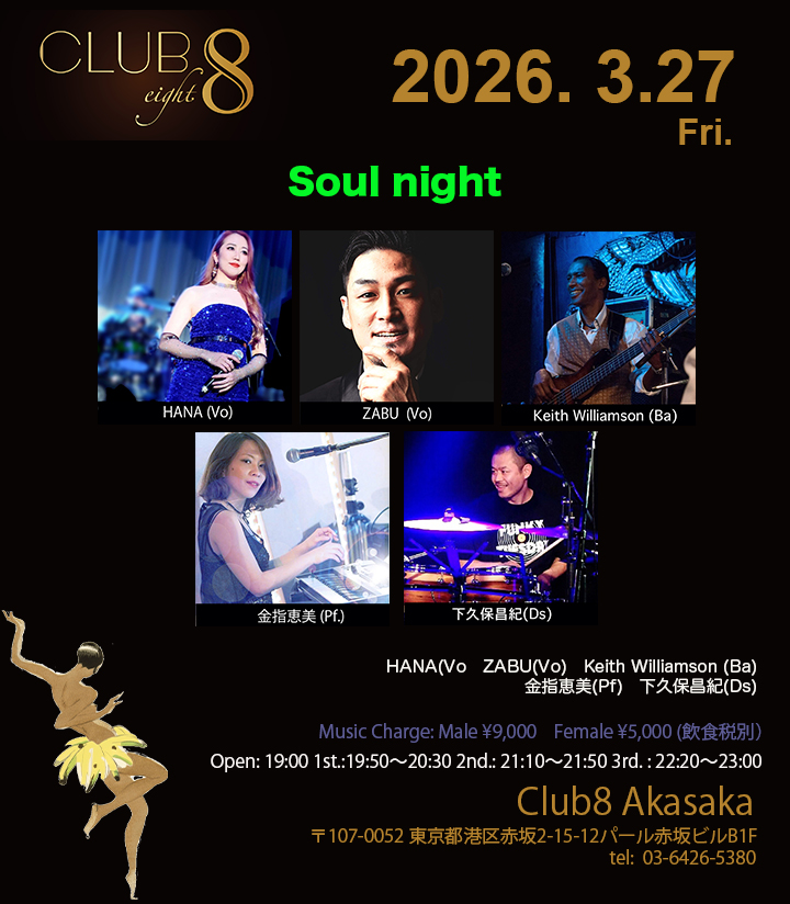 3/27(金)【Soul night】 HANA(Vo)ZABU(Vo)Keith Williamson (Ba)金指恵美(Pf)下久保昌紀(Ds) Open: 19:00 1st.: 19:50〜20:30 2nd.: […]