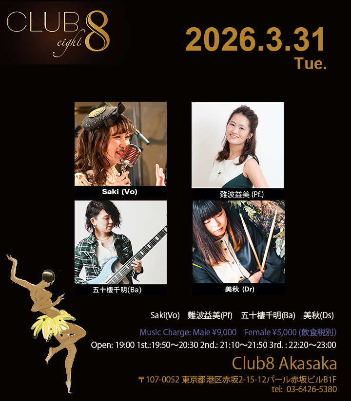3/31(火) Saki(Vo)難波益美(Pf)五十棲千明(Ba)美秋(Ds) Open: 19:00 1st.: 19:50〜20:30 2nd.: 21:10〜21:50 3rd. : 22:20〜23:00 CLU […]