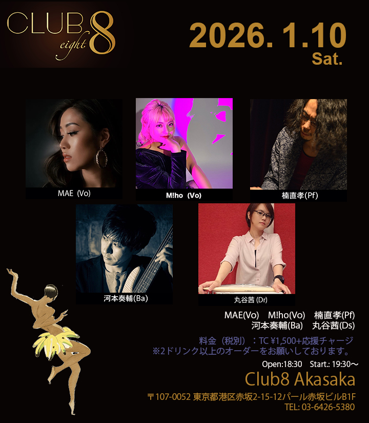 1/5(月) Yoko JK(Vo)MAE(Vo)堺敦生(Pf) Open: 19:00 1st.: 19:50〜20:30 2nd.: 21:10〜21:50 3rd. : 22:20〜23:00 CLUB 8 Aka […]