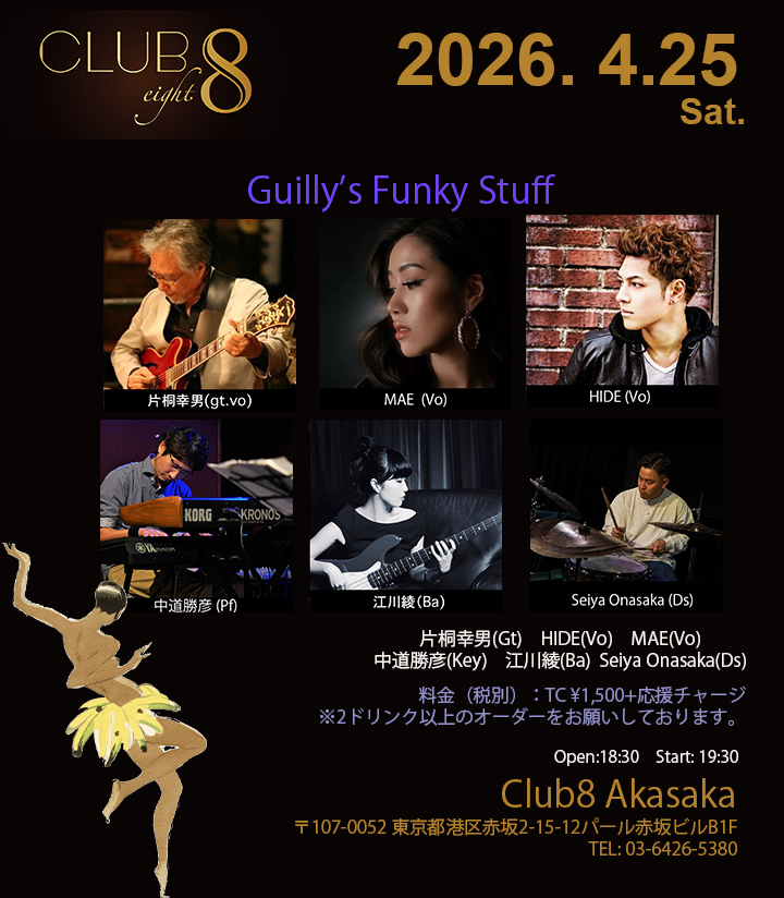 4/25(土)【Guilly’s Funky Stuff】ZABU(Vo)MAE(Vo)片桐幸男(Gt)中道勝彦(Key)江川綾(Ba)Seiya Onasaka(Ds)Open:18:30Start:19:30~料金( […]