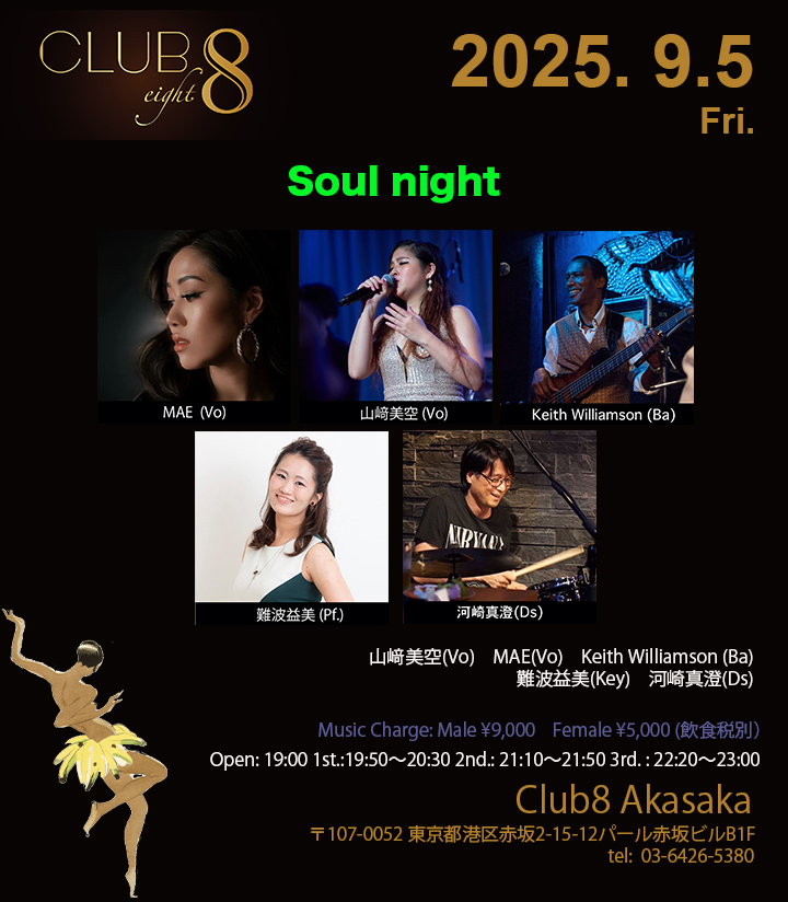 9/5(金)【Soul night】 山﨑美空(Vo) MAE(Vo) Keith Williamson (Ba) 難波益美(Key) 河崎真澄(Ds) Open: 19:00 1st.: 19:50〜20:30 2nd […] |