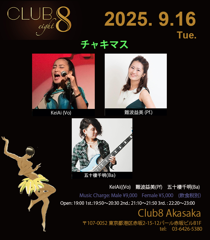 9/16(火)【チャキマス】 KeiAi((Vo)難波益美(Pf)五十棲千明(Ba)Open: 19:001st.: 19:50〜20:302nd.: 21:10〜21:503rd. : 22:20〜23: […] |