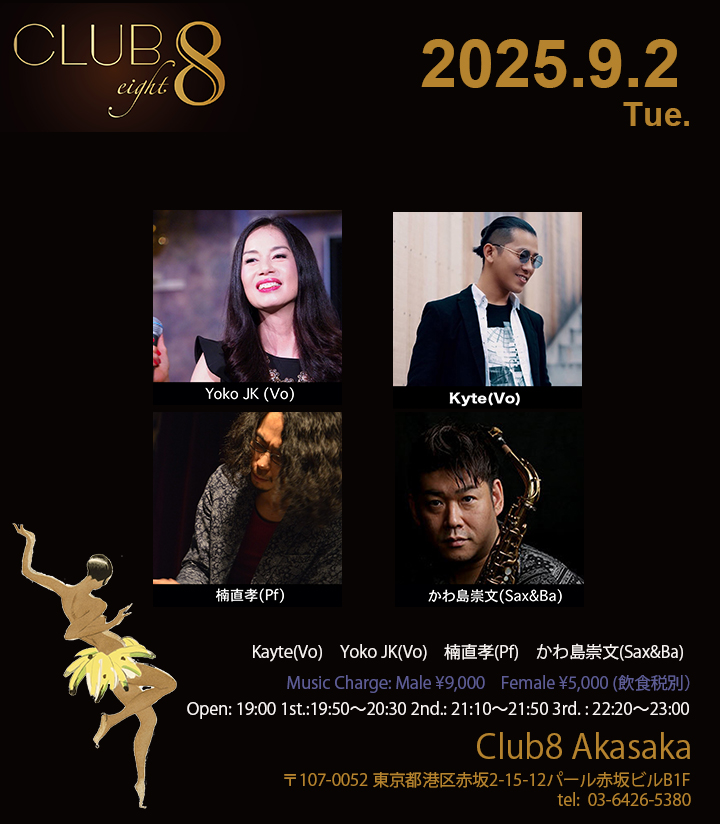 9/2(火)Kyte(Vo)Yoko JK(Vo)楠直孝(Pf)かわ島崇文(Sax&Ba) Open: 19:001st.: 19:50〜20:302nd.: 21:10〜21:503rd. : 2 […] |