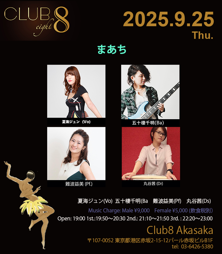 9/25(木)【まあち】 夏海ジュン(Vo)五十棲千明(Ba)難波益美(Pf)丸谷茜(Ds) Open: 19:00 1st.: 19:50〜20:30 2nd.: 21:10〜21:50 3rd. : 22:20〜23 […] |