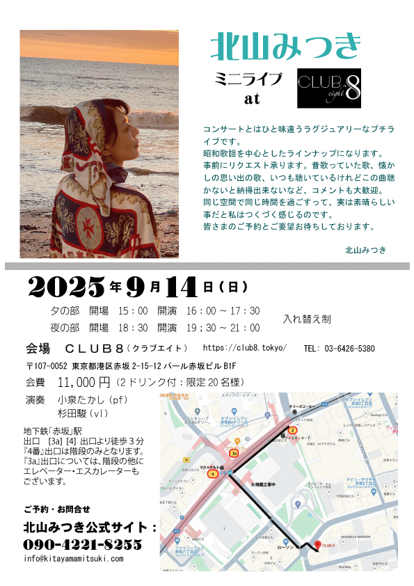 9/14(日)【北山みつきミニライブ 】 北山みつき(Vo) 小泉たかし (pf) 杉田駿(VI) (入れ替え制) 夕の部 開場:15:00 開演:16:00~17:30 夜の部 開場:18:30 開演19:30 […] |