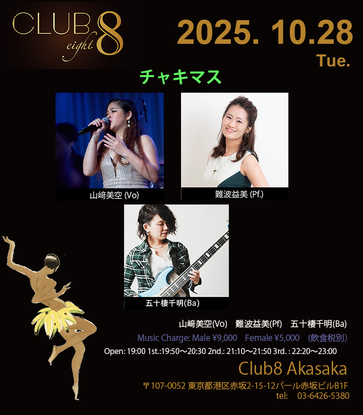 10/28(火)【チャキマス】 山﨑美空(Vo)難波益美(Pf)五十棲千明(Ba) Open: 19:00 1st.: 19:50〜20:30 2nd.: 21:10〜21:50 3rd. : 22:20〜23:00 C […] |