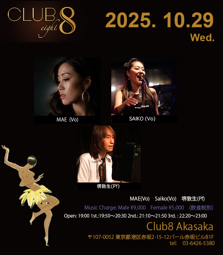 10/29(水) MAE(Vo)Saiko(Vo)堺敦生(Pf) Open: 19:00 1st.: 19:50〜20:30 2nd.: 21:10〜21:50 3rd. : 22:20〜23:00 CLUB 8 Aka […] |