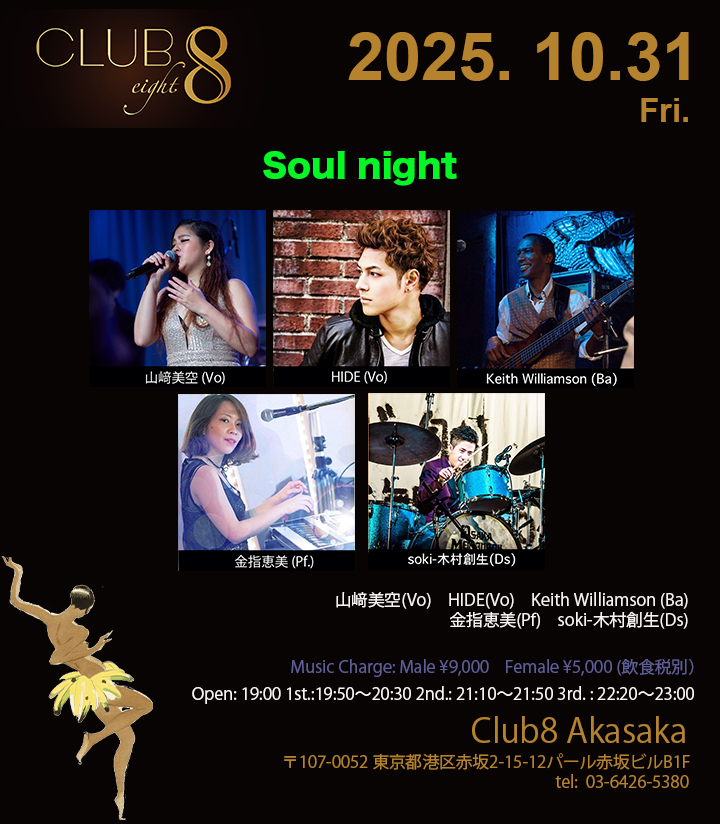 10/31(金)【Soul night】 山﨑美空(Vo)HIDE(Vo)Keith Williamson (Ba)金指恵美(Pf)soki-木村創生(Ds) Open: 19:00 1st.: 19:50〜20:30 […] |