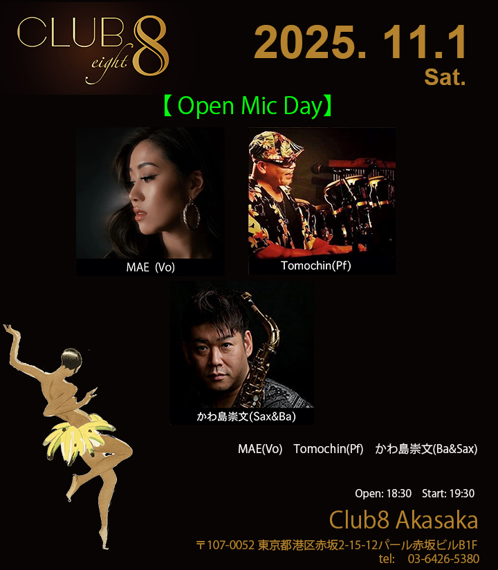 11/1(土) 【Open Mic Day】MAE(Vo)Tomochin(Pf)かわ島崇文(Ba&Sax) オープンマイクDAY!ぜひご参加ください!Open: 18:30Start: 19:30〜¥9000男 […] |