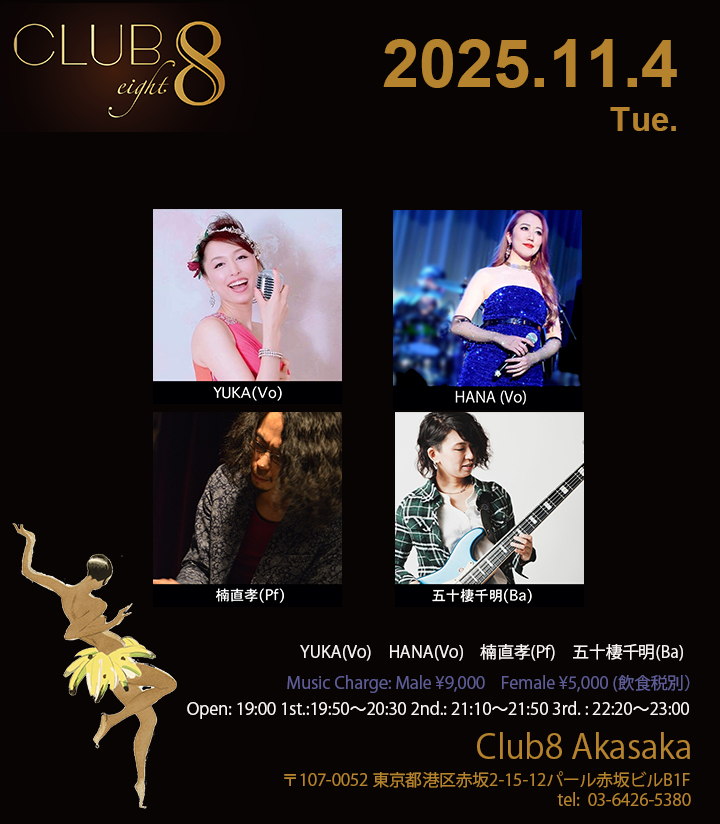 11/4(火) YUKA(Vo)HANA(Vo)楠直孝(Pf)五十棲千明(Ba) Open: 19:00 1st.: 19:50〜20:30 2nd.: 21:10〜21:50 3rd. : 22:20〜23:00 CL […] |