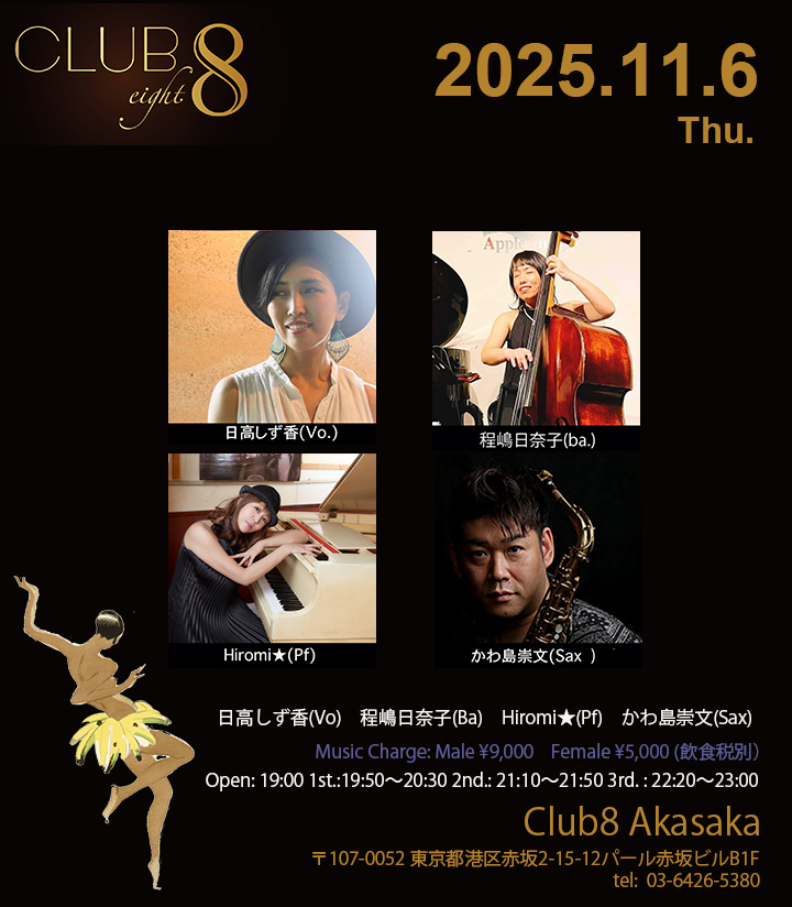 11/6(木)【Smooth Jazz Night】日高しず香(Vo)程嶋日奈子(Ba)Hiromi★(Pf)かわ島崇文(Sax) Open: 19:001st.: 19:50〜20:302nd.: 21:10〜21:5 […] |