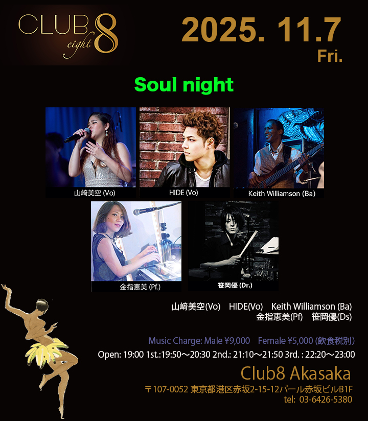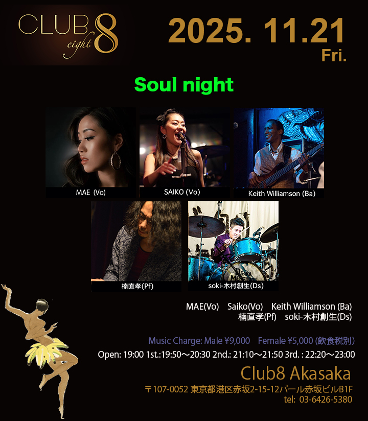 11/21(金)【Soul night】 MAE(Vo)Saiko(Vo)Keith Williamson (Ba)楠直孝(Pf)soki-木村創生(Ds) Open: 19:00 1st.: 19:50〜20:30 2 […] |