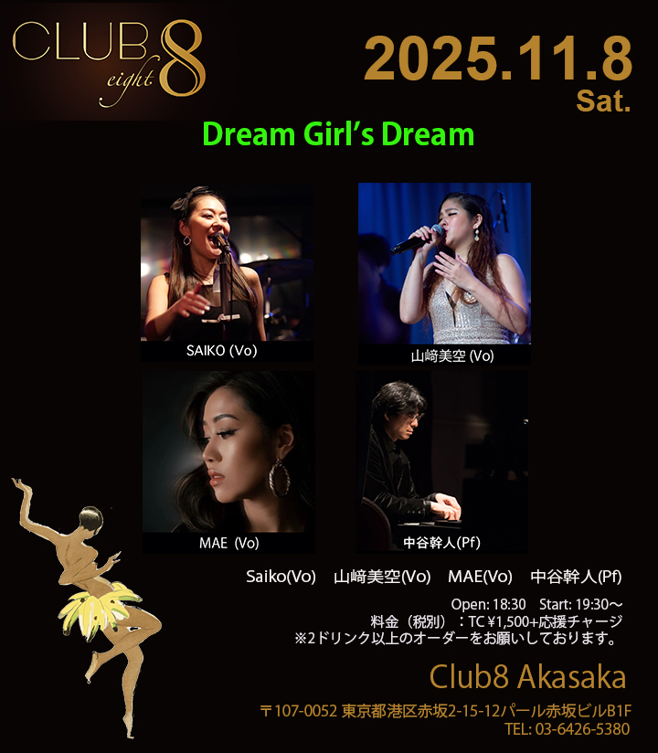 11/8(土)【 Dream Girl’s Dream】 Saiko(Vo)山﨑美空(Vo)MAE(Vo)中谷幹人(Pf) Open: 18:30 Start: 19:30〜 料金(税別):TC ¥1500+応援チャージ […] |