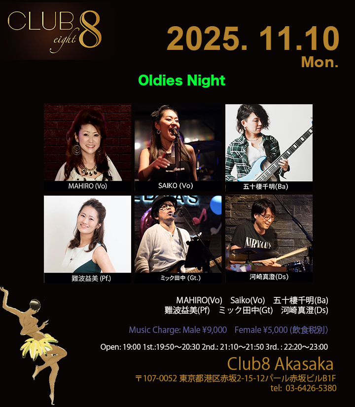 11/10(月)【Oldies Night】 MAHIRO(Vo)Saiko(Vo)五十棲千明(Ba)難波益美(Pf)ミック田中(Gt)河崎真澄(Ds)Open: 19:001st.: 19:50〜20:302nd.: […] |