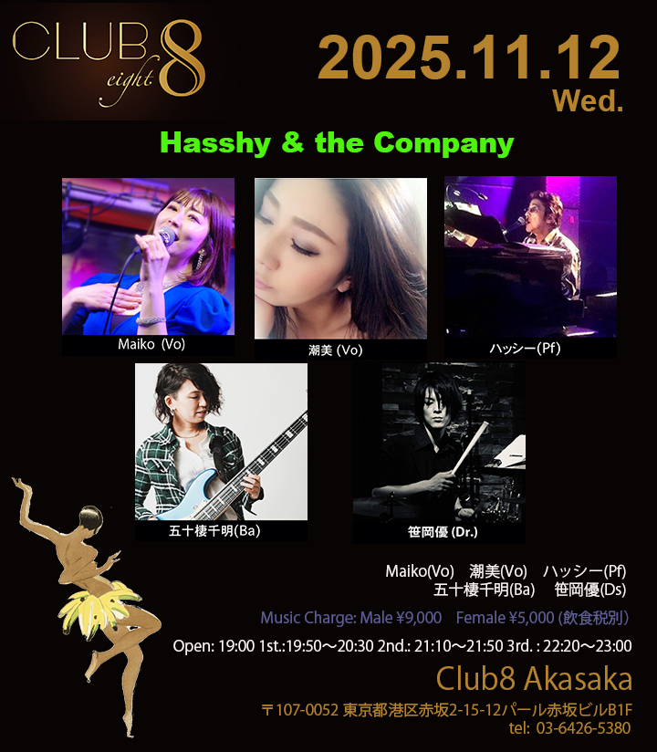 11/12(水)【Hasshy&the Company】 Maiko(Vo)潮美(Vo)ハッシー(Pf) 五十棲千明(Ba) 笹岡優(Ds) Open: 19:00 1st.: 19:50〜20:30 2nd.: […] |