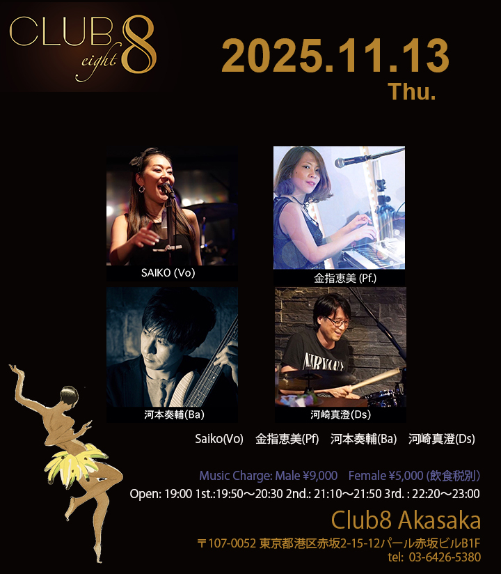 11/13(木)Saiko(Vo)金指恵美(Pf)河本奏輔(Ba)河崎真澄(Ds)Open: 19:001st.: 19:50〜20:302nd.: 21:10〜21:503rd. : 22:20〜23:0 […] |