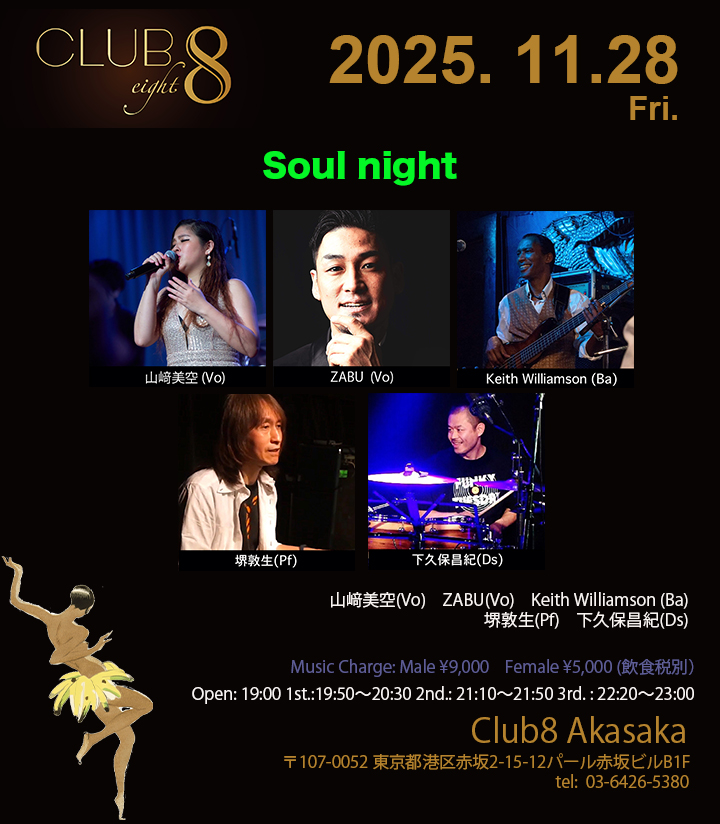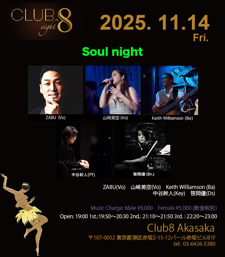 11/14(金)【Soul night】 ZABU(Vo) 山﨑美空(Vo) Keith Williamson (Ba) 中谷幹人(Key) 笹岡優(Ds) Open: 19:00 1st.: 19:50〜20:30 2 […] |