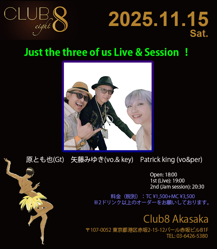 11/15(土)【Just the three of us Live & Session!】 Just the Three of Us: Patrick King(Vo& per)矢藤みゆき(Vo& […] |