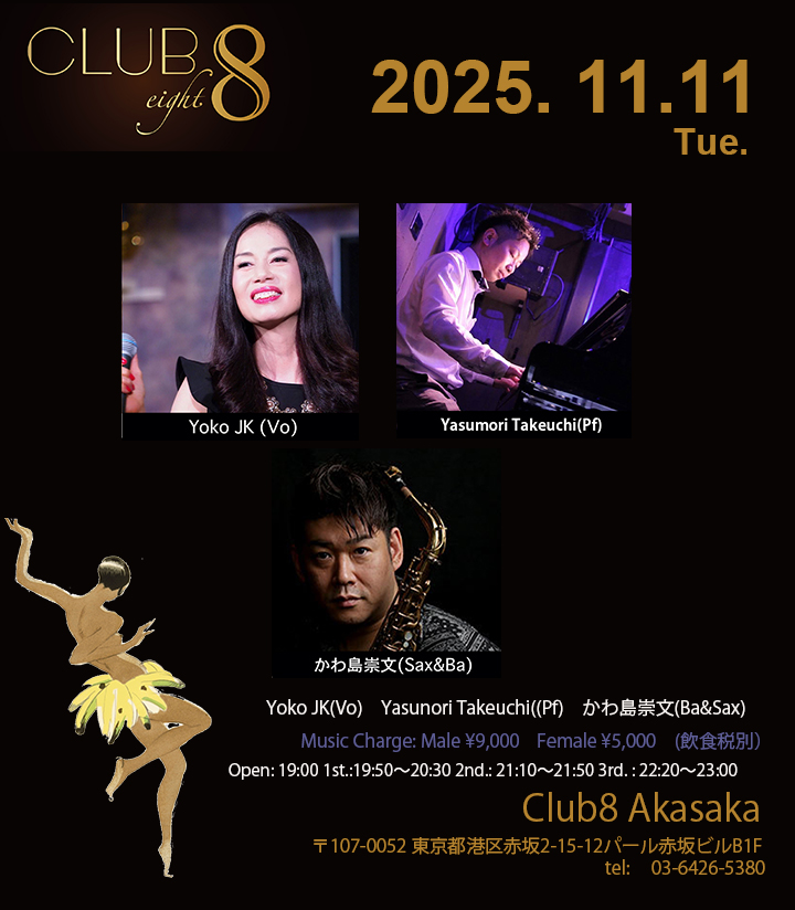 11/11(火)Yoko JK(Vo)Yasunori Takeuchi((Pf)かわ島崇文(Ba&Sax)Open: 19:001st.: 19:50〜20:302nd.: 21:10〜21:50 […] |