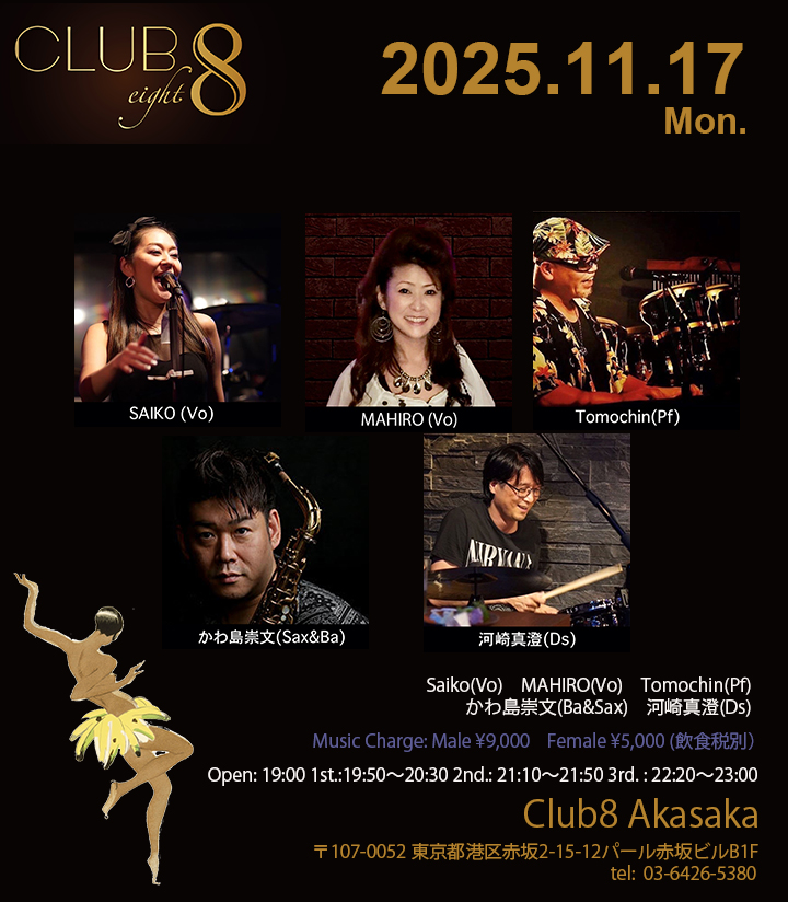 11/17(月) Saiko(Vo)MAHIRO(Vo)Tomochin(Pf)かわ島崇文(Ba&Sax)河崎真澄(Ds) Open: 19:00 1st.: 19:50〜20:30 2nd.: 21:10〜21 […] |