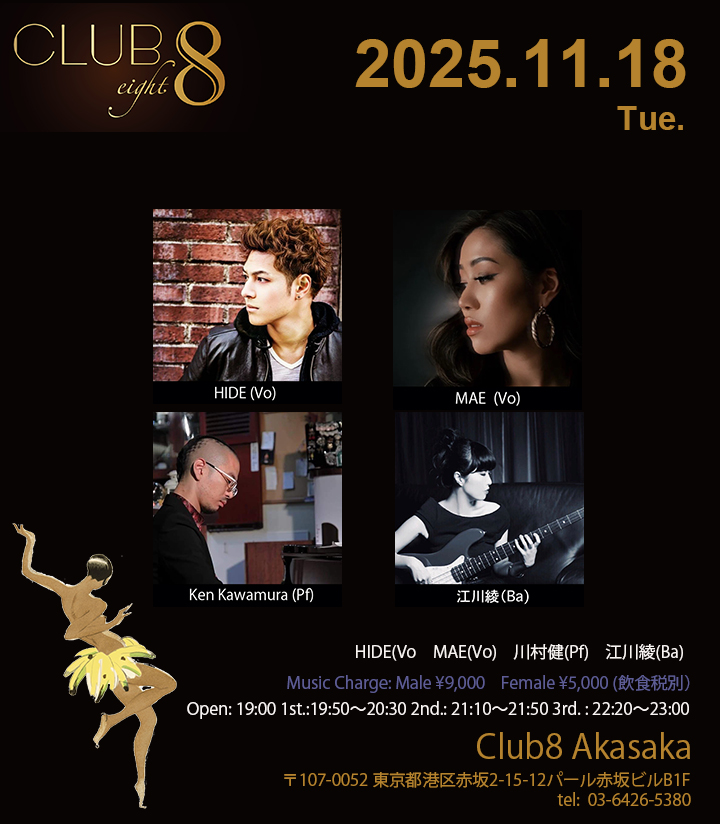 11/18(火) HIDE(Vo)MAE(Vo)川村健(Pf)江川綾(Ba) Open: 19:00 1st.: 19:50〜20:30 2nd.: 21:10〜21:50 3rd. : 22:20〜23:00 CLUB […] |
