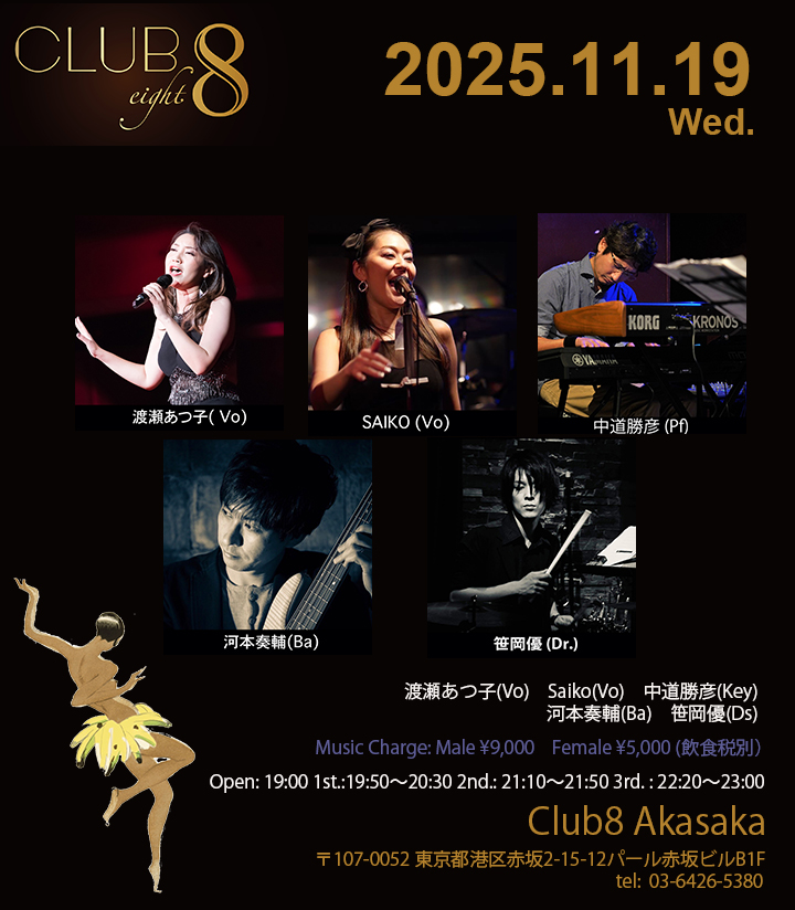 11/19(水) 渡瀬あつ子(Vo)Saiko(Vo)中道勝彦(Key)河本奏輔(Ba)笹岡優(Ds) Open: 19:00 1st.: 19:50〜20:30 2nd.: 21:10〜21:50 3rd. : 22: […] |