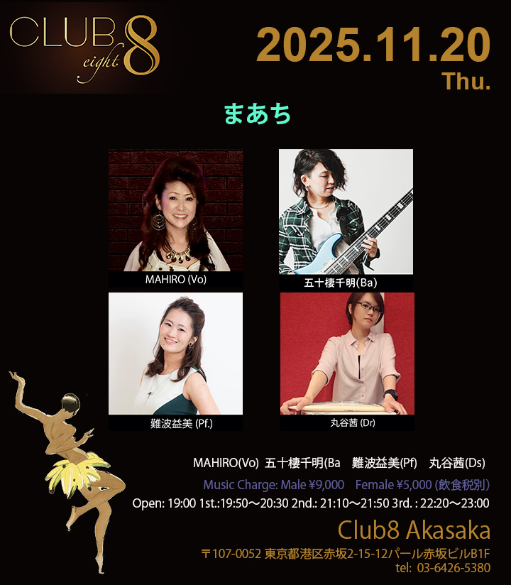 11/20(木)【まあち】 MAHIRO(Vo)(Vo)五十棲千明(Ba)難波益美(Pf)丸谷茜(Ds) Open: 19:00 1st.: 19:50〜20:30 2nd.: 21:10〜21:50 3rd. : 22 […] |