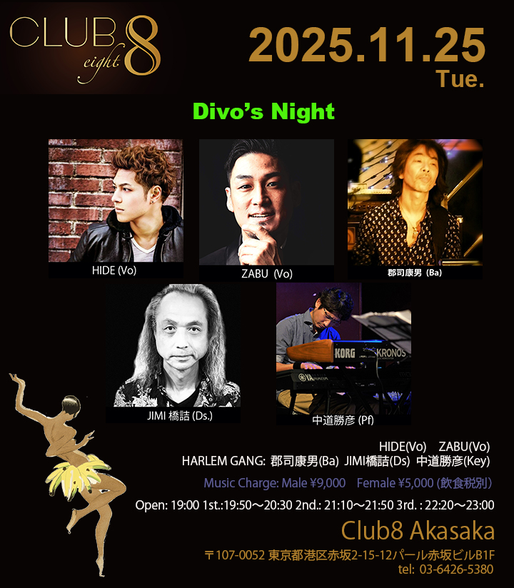 11/25(火)【Divo’s Night】 HIDE(Vo)ZABU(Vo)HARLEM GANG:郡司康男(Ba)JIMI橋詰(Ds)中道勝彦(Key)Open: 19:001st.: 19:50〜20:302nd. […] |