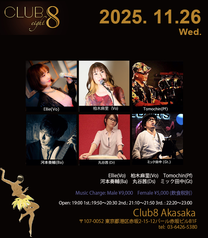 11/26(水) 柏木麻里(Vo) Ellie(Vo)Tomochin(Pf) 丸谷茜(Ds) 河本奏輔(Ba) ミック田中(Gt) Open: 19:00 1st.: 19:50〜20:30 2nd.: 21:10〜2 […] |