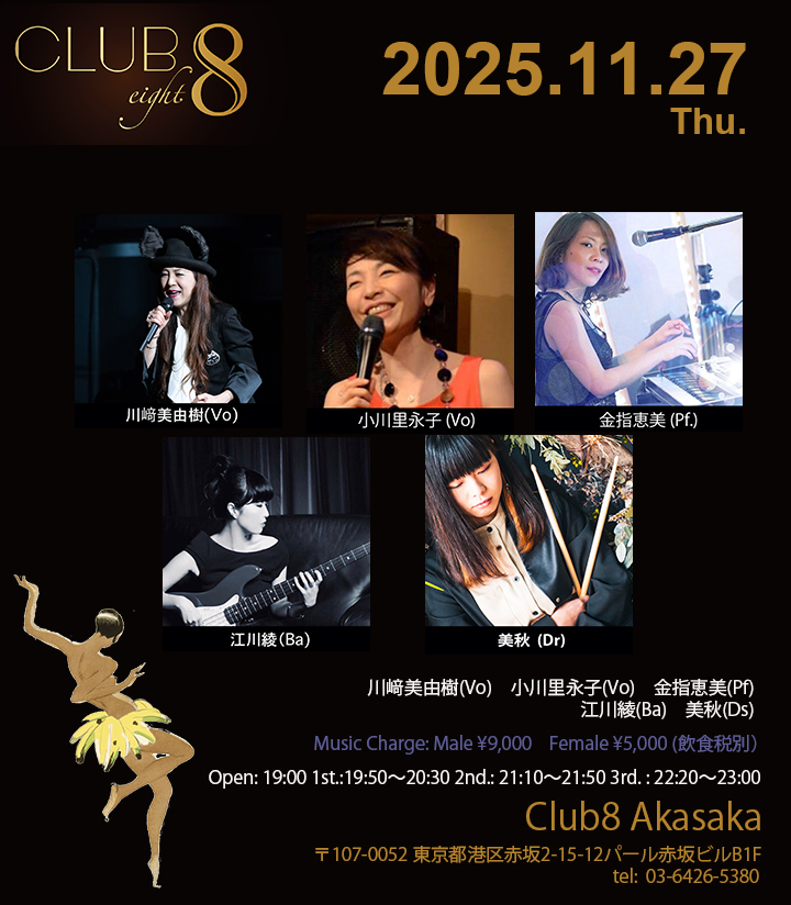 11/27(木) 川﨑美由樹(Vo)小川里永子(Vo)金指恵美(Pf)江川綾(Ba)美秋(Ds) Open: 19:00 1st.: 19:50〜20:30 2nd.: 21:10〜21:50 3rd. : 22:20〜 […] |
