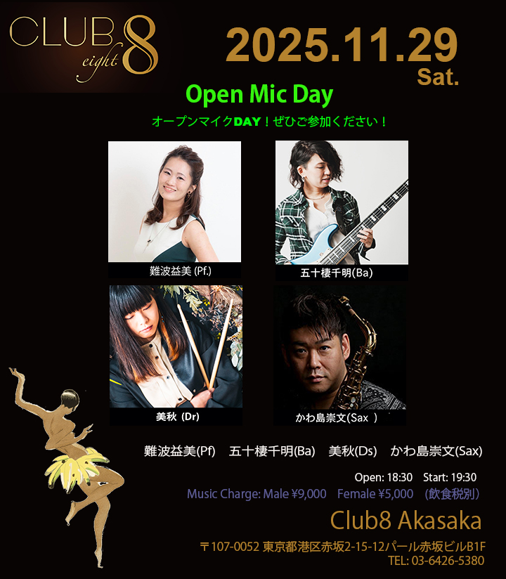 11/29(土) 【Open Mic Day】難波益美(Pf)五十棲千明(Ba)美秋(Ds)かわ島崇文(Sax)オープンマイクDAY!ぜひご参加ください!Open: 18:30Start: 19:30〜 Music Ch […] |