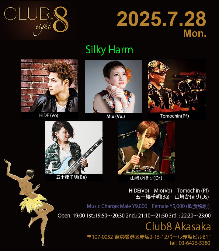 7/28(月)【Silky Harm】 HIDE(Vo)Mio(Vo)Tomochin (Pf)河本奏輔(Ba)山﨑かほり(Ds)Open: 19:001st.: 19:50〜20:302nd.: 21:10〜21:503rd. : 22:20〜23:00CLUB 8 Akasaka〒107-0052 東京都港区赤坂2-15-12パール赤坂ビルB1FTEL: /03-6426-5380https://club8.tokyo/