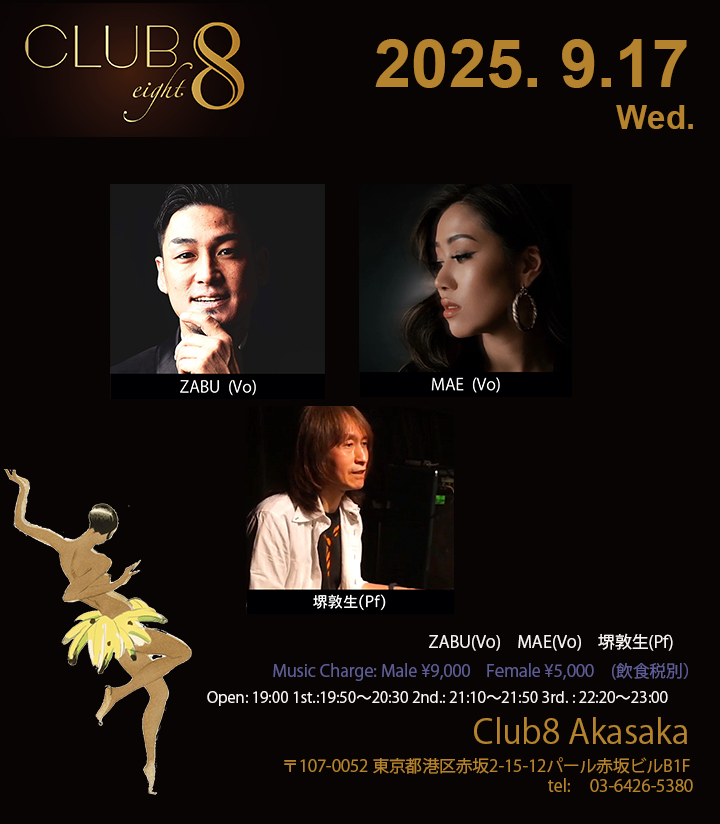 9/17(水)ZABU(Vo)MAE(Vo)堺敦生(Pf)Open: 19:001st.: 19:50〜20:302nd.: 21:10〜21:503rd. : 22:20〜23:00CLUB 8 Akasaka〒107-0052 東京都港区赤坂2-15-12パール赤坂ビルB1FTEL: /03-6426-5380https://club8.tokyo/